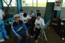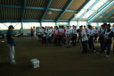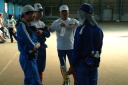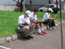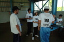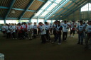 屋内ゲートボール場にて待機し、それぞれにスタート順を待つ選手たちでした。